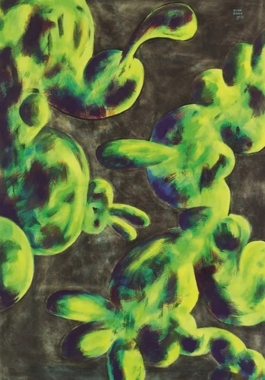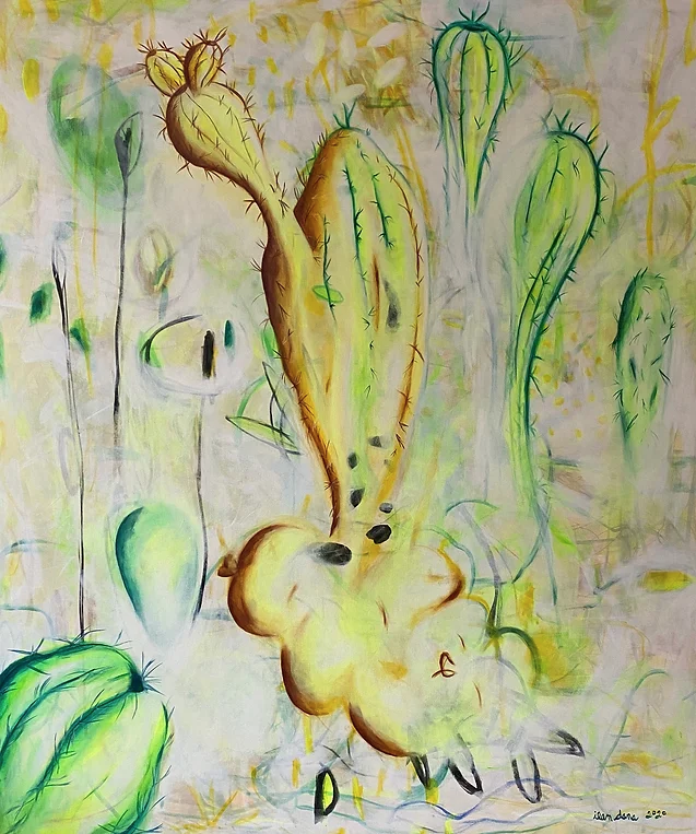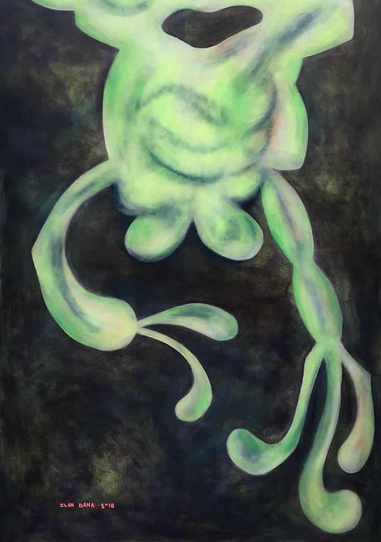 El lenguaje curvo de las figuras protagónicas en mis cuadros es una referencia a los hábitos biológicos espontáneos. Aunque la geometrÃa rige al universo en comportamiento (patrones), un ángulo rara vez aparece en la naturaleza: esta es siempre fresca y atrevida. Mas aun, el microcosmos semeja el macrocosmos, esto recalca la importancia de participar en descifrar la esencia y rol humano en este ecosistema celeste. Todos somos todo."